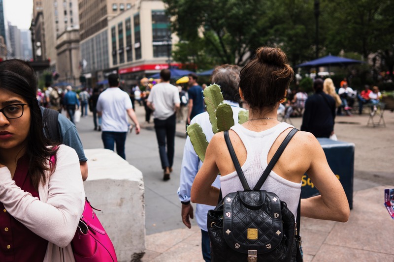 In a bustling urban scene, a woman carries a large cactus on her back, juxtaposing nature with city life. The composition captures a dynamic movement of pedestrians, with the cactus serving as an unexpected focal point that adds a touch of whimsy. Soft natural light bathes the scene, creating a vibrant yet relaxed atmosphere that invites curiosity.