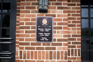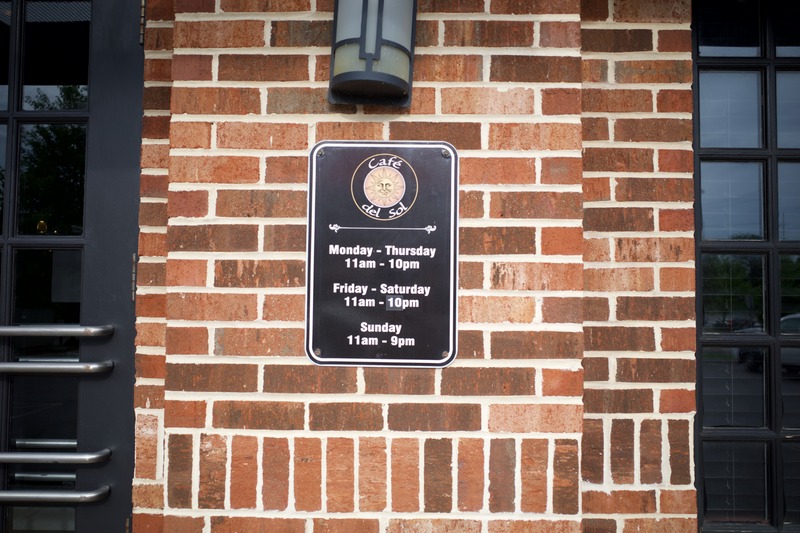 This photograph captures a welcoming brick wall adorned with a sign for Cafe del Sol, highlighting the establishment's operating hours. The warm tones of the brick contrast with the sleek black signage, creating an inviting atmosphere. Soft natural light enhances the rustic charm, suggesting a cozy dining experience.