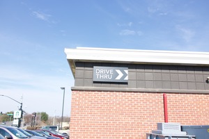 The photograph captures the angular edge of a building with a clear 'DRIVE THRU' sign prominently displayed against a backdrop of brick and gray siding. Bright daylight illuminates the scene, enhancing the modern, functional aesthetic. The composition leads the eye towards the sign, emphasizing themes of convenience in contemporary urban life.