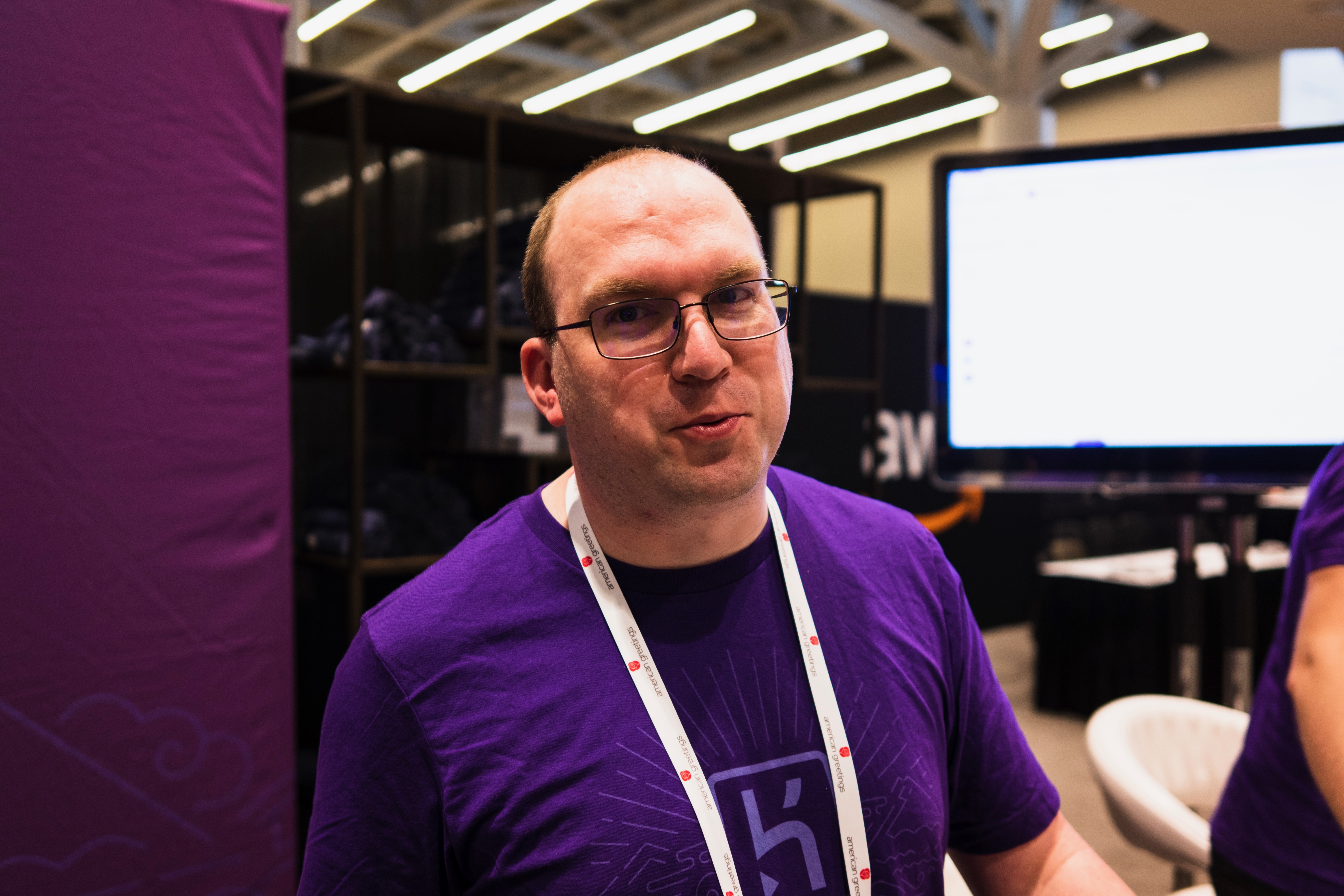 In this vibrant photograph, a man in a purple shirt stands in a bustling event space, conveying a sense of approachability and engagement. Warm lighting highlights his expression, creating a friendly atmosphere that invites conversation. The soft focus on the background enhances the subject's prominence against the lively event backdrop, suggesting an environment filled with interaction and excitement.