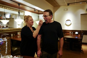 A woman playfully offers a bite of dessert to a man in a charming restaurant setting, capturing a moment of lighthearted intimacy. The warm lighting creates an inviting atmosphere, while the background hints at a lively dining area. Their joyful expressions convey a sense of connection, emphasizing the warmth of shared experiences over a meal.
