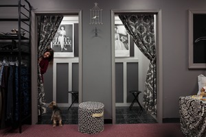 This photograph captures an intimate moment in a boutique fitting room, where a woman peeks from behind a patterned curtain, exuding playful curiosity. The lighting casts a soft glow, highlighting the contrasting textures of the fabrics and the inviting space. A small dog attentively awaits, adding a touch of warmth and charm to the scene.