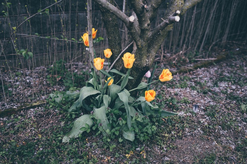 Bright yellow tulips bloom vibrantly against the muted tones of a weathered tree trunk, symbolizing growth and renewal. The composition anchors the viewer’s gaze at the base of the tree, where life thrives amidst the shadows of a cool, subdued background. Soft, natural lighting enhances the delicate petals, creating an atmosphere of quiet beauty and serene hope.