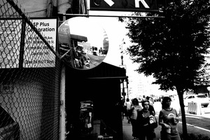 This black-and-white photograph captures a bustling street scene reflected in a convex mirror, contrasting the stillness of the foreground pedestrians. The interplay of light and shadow highlights the dynamic tension between movement and pause, creating a sense of both vibrancy and contemplation in the urban environment. The composition draws the viewer’s eye through layers of texture, from the fence to the signage, immersing them in the city's rhythm.