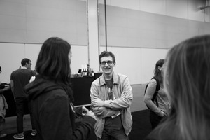 In a candid moment, a young man stands at the center, enveloped by a group engaged in conversation, exuding warmth and approachability. The soft black-and-white tones create an intimate atmosphere, while the subtle play of light enhances the focus on the subject's relaxed demeanor. The backdrop is minimalist, emphasizing the human connection and lively interaction within the spacious setting.
