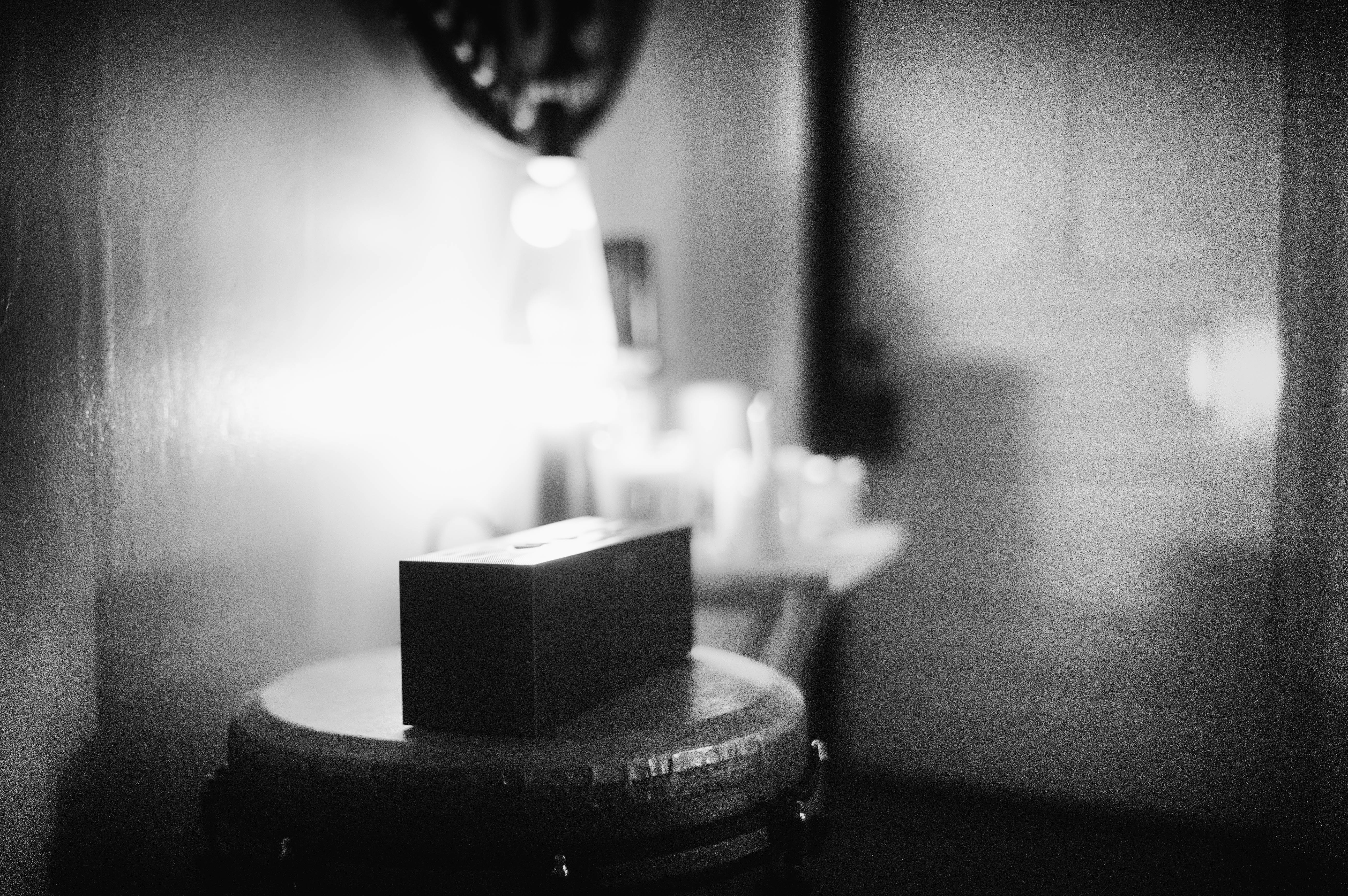 The photograph captures a solitary speaker perched atop a conga drum, bathed in gentle, soft light that adds an air of intimacy and nostalgia. Shadows play around the dimly lit room, creating a striking contrast between the rich textures and subtle details of the objects. The composition evokes a sense of quiet contemplation, inviting viewers to ponder the sounds yet to fill the space.