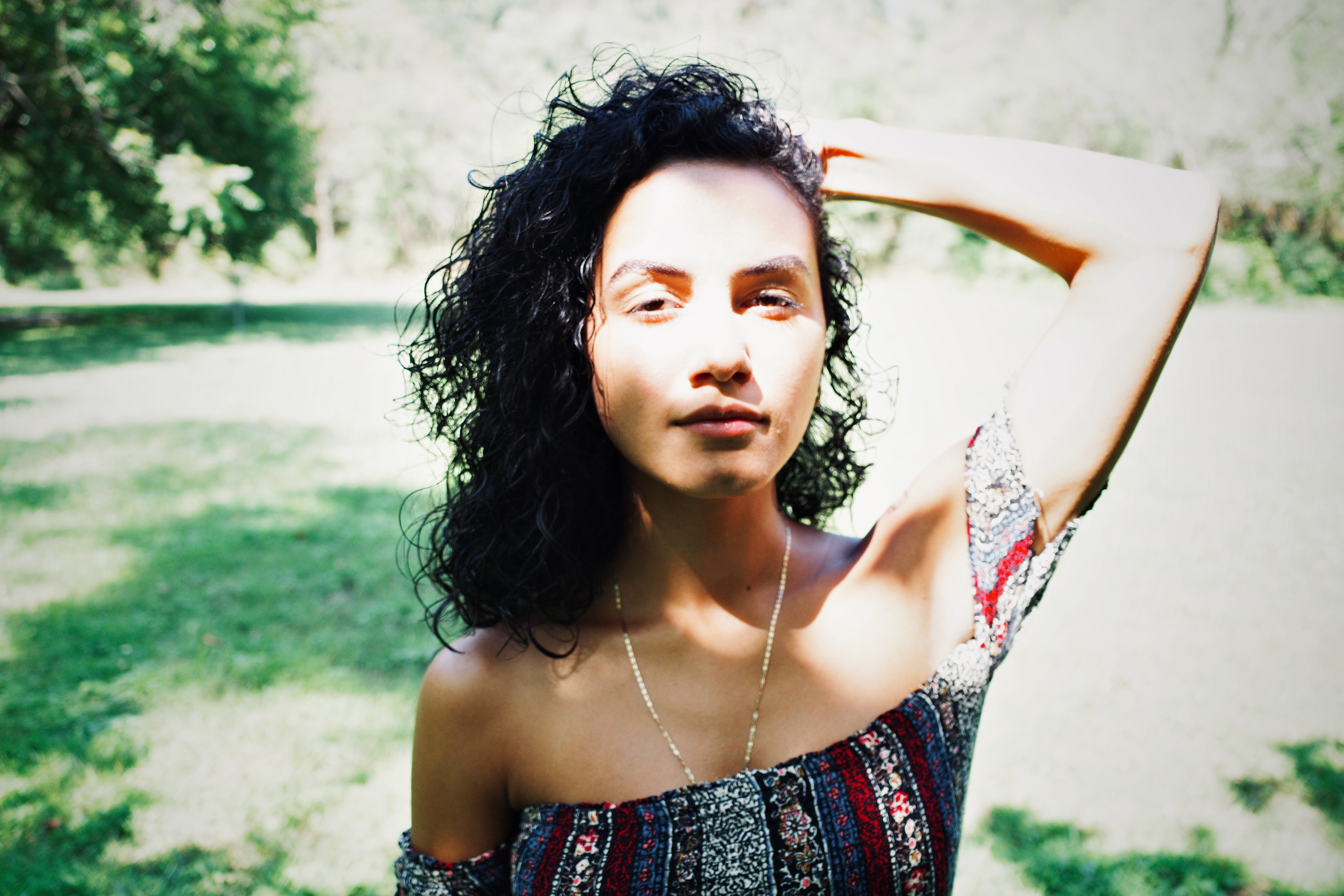 In this captivating photograph, a young woman stands confidently in a sun-drenched field, her curly hair catching the light. The interplay of shadows and sunlight creates a dreamlike quality, enhancing her serene expression and accentuating the vibrant textures of her patterned top. The lush green background juxtaposes the warmth of her skin, infusing the image with a sense of tranquil beauty and connection to nature.