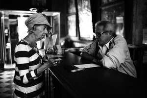 In a dimly lit environment, an elderly woman wearing a striped shirt and a headscarf engages in conversation with a man behind the counter, creating an intimate yet tense atmosphere. The stark black-and-white contrast amplifies the emotional weight of their exchange, while soft glimmers of light from the surrounding windows provide a subtle backdrop. Their focused expressions suggest a moment ripe with significance, allowing viewers to ponder the nature of their interaction.