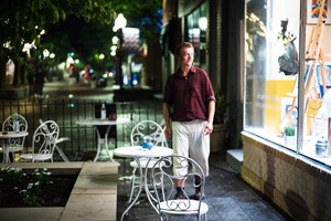 A solitary man walks along a quiet street at night, illuminated by soft streetlights and the warm glow of shop windows. The empty tables suggest a serene setting, while the reflections on the wet pavement enhance the tranquil mood. The composition captures an intimate moment, evoking feelings of solitude and contemplation in an urban environment.