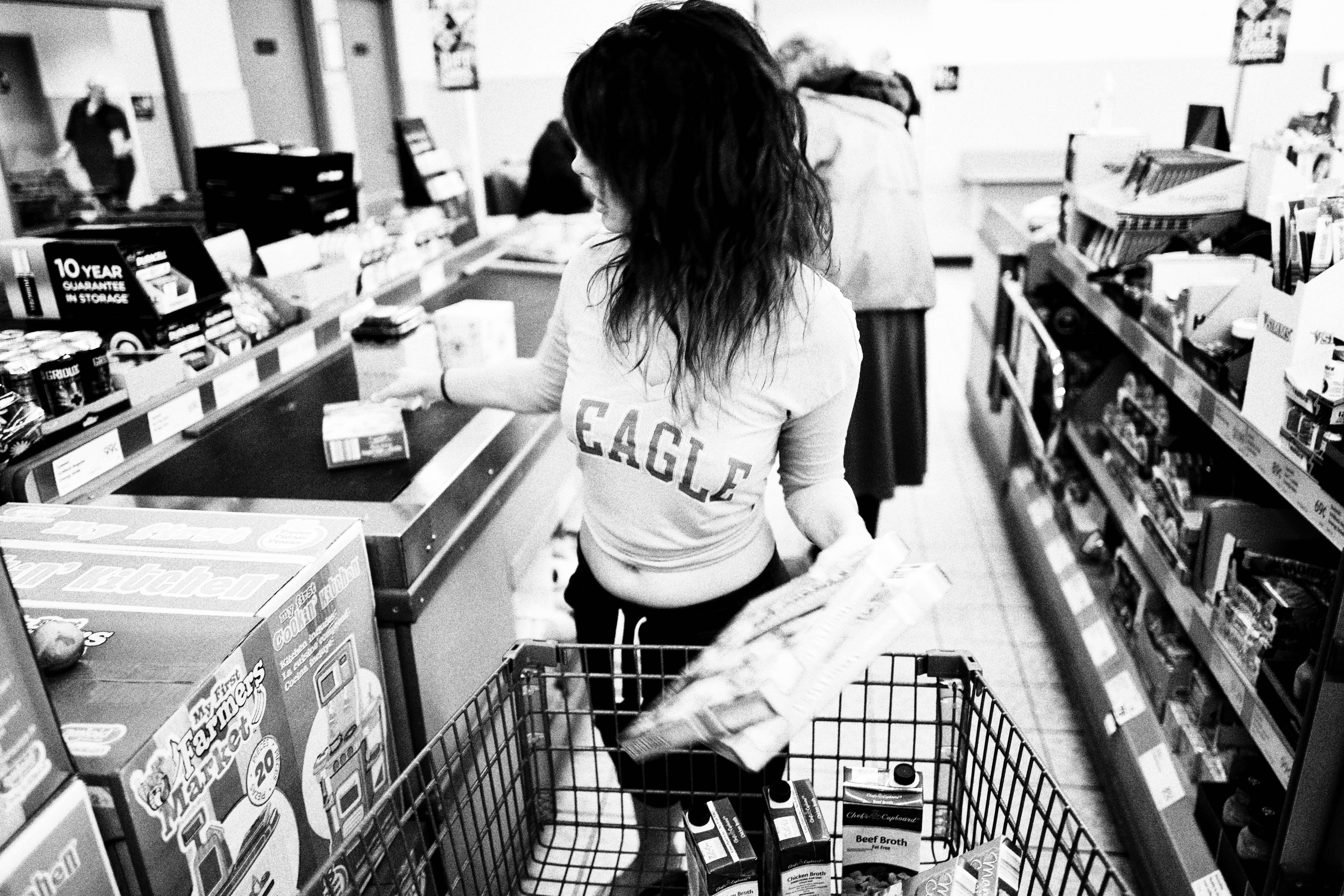 In this black and white photograph, a woman in an eagle-emblazoned shirt selects items in a bustling supermarket aisle. The composition captures her focused engagement with the shopping experience, while the surrounding shoppers create a sense of everyday life. The soft lighting adds a nostalgic quality, emphasizing the candid nature of the scene.