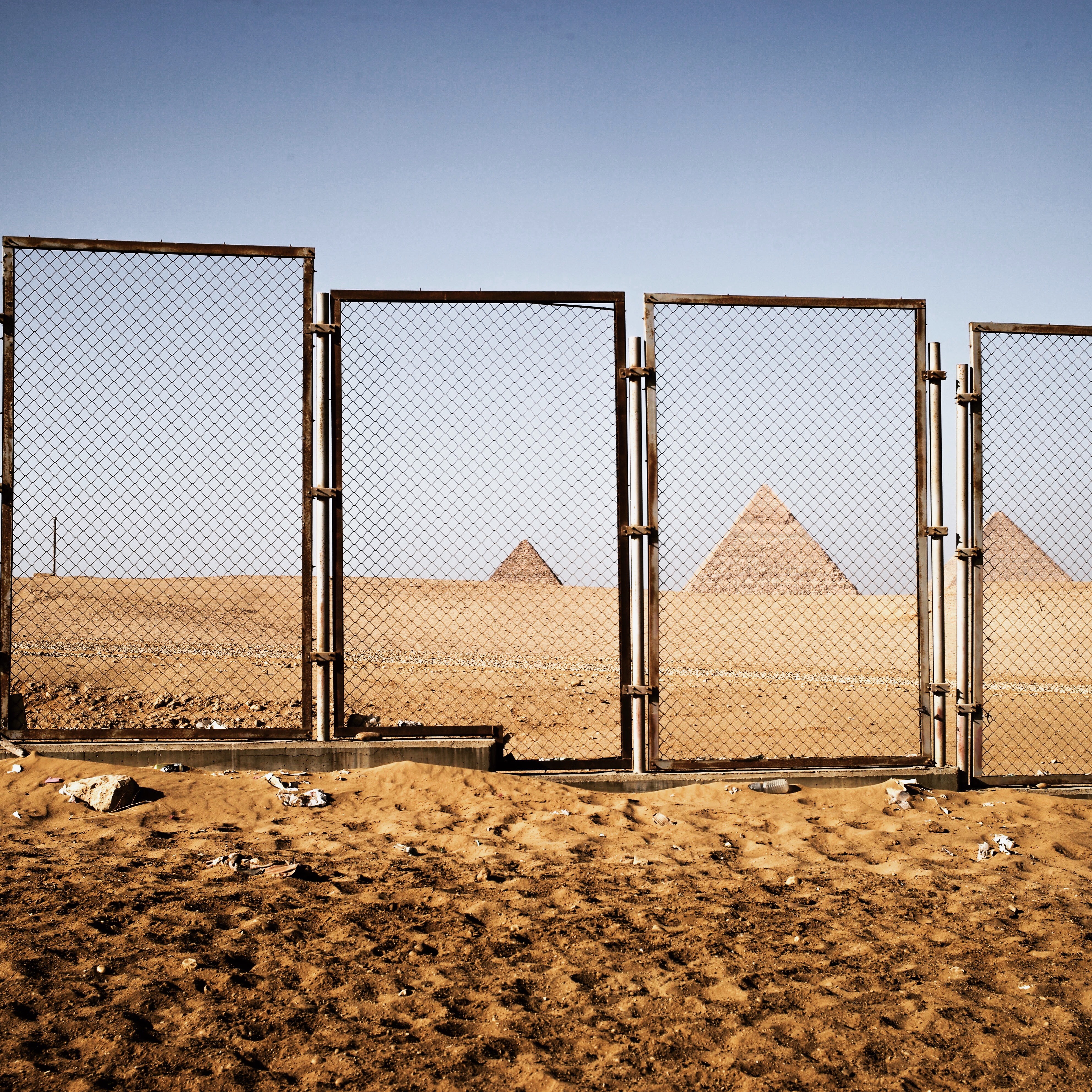 This photograph captures a stark contrast between a chain-link fence and the ancient pyramids of Giza in the background. The sharp, industrial lines of the fence juxtapose against the timeless, monumental structures, creating a mood of confinement intertwined with historical grandeur. The warm desert light bathes the scene, enhancing the sense of isolation and the weight of history looming just beyond the barriers.