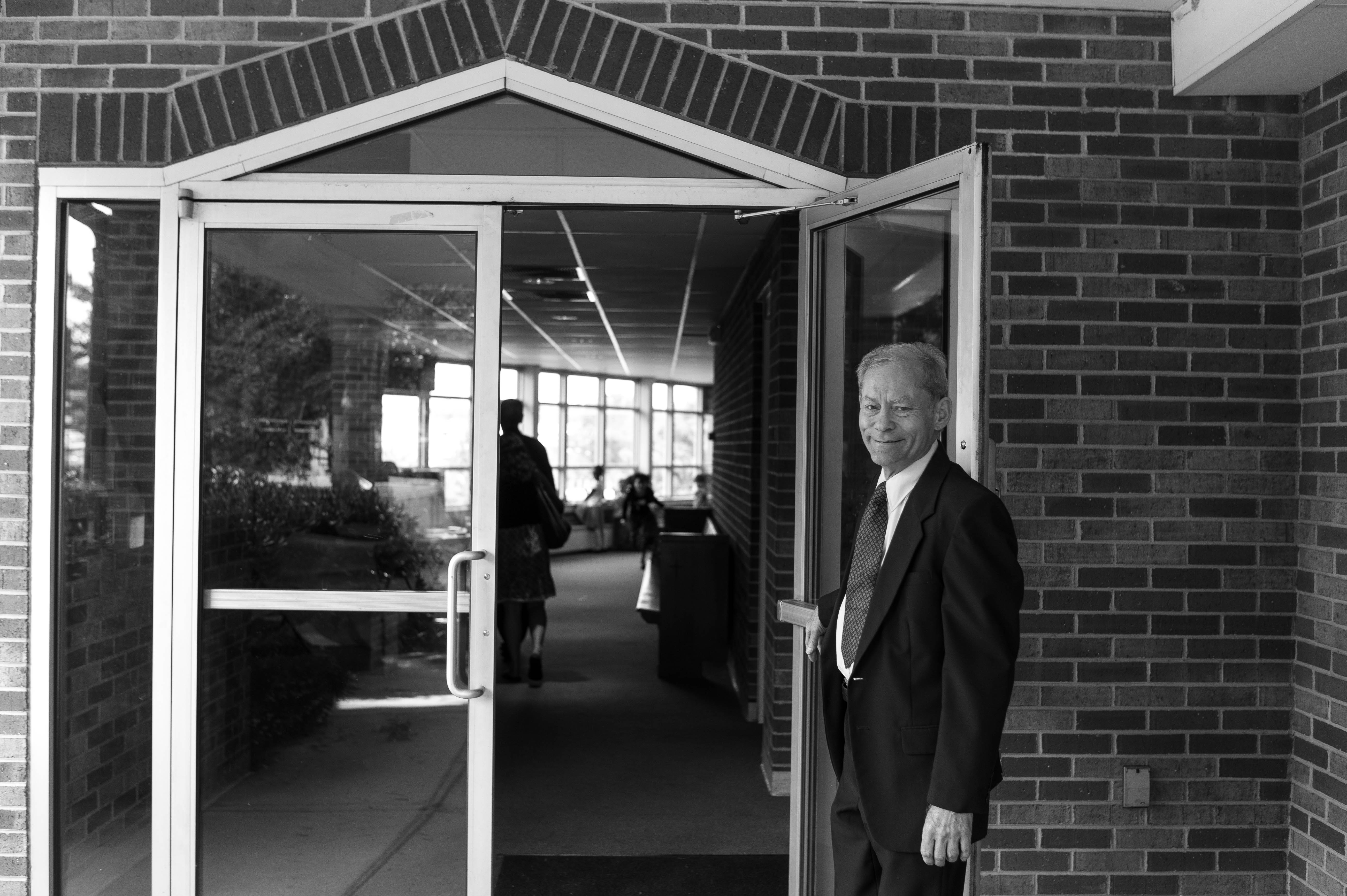 Captured in monochrome, this photograph features a man in a suit standing gracefully at an open doorway, a gentle smile hinting at warmth and invitation. The composition juxtaposes the man's poised demeanor against a slightly blurred background, where others are absorbed in conversation, creating a sense of community and engagement. Soft, natural light filters through the glass, enhancing the welcoming atmosphere of the setting.