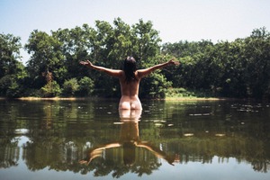 A solitary figure stands in tranquil water, arms outstretched as if welcoming the surroundings. The lush greenery creates a serene backdrop, while the bright sunlight bathes the scene in a warm glow, accentuating the water's reflective surface. This moment captures a feeling of liberation and connection with nature.