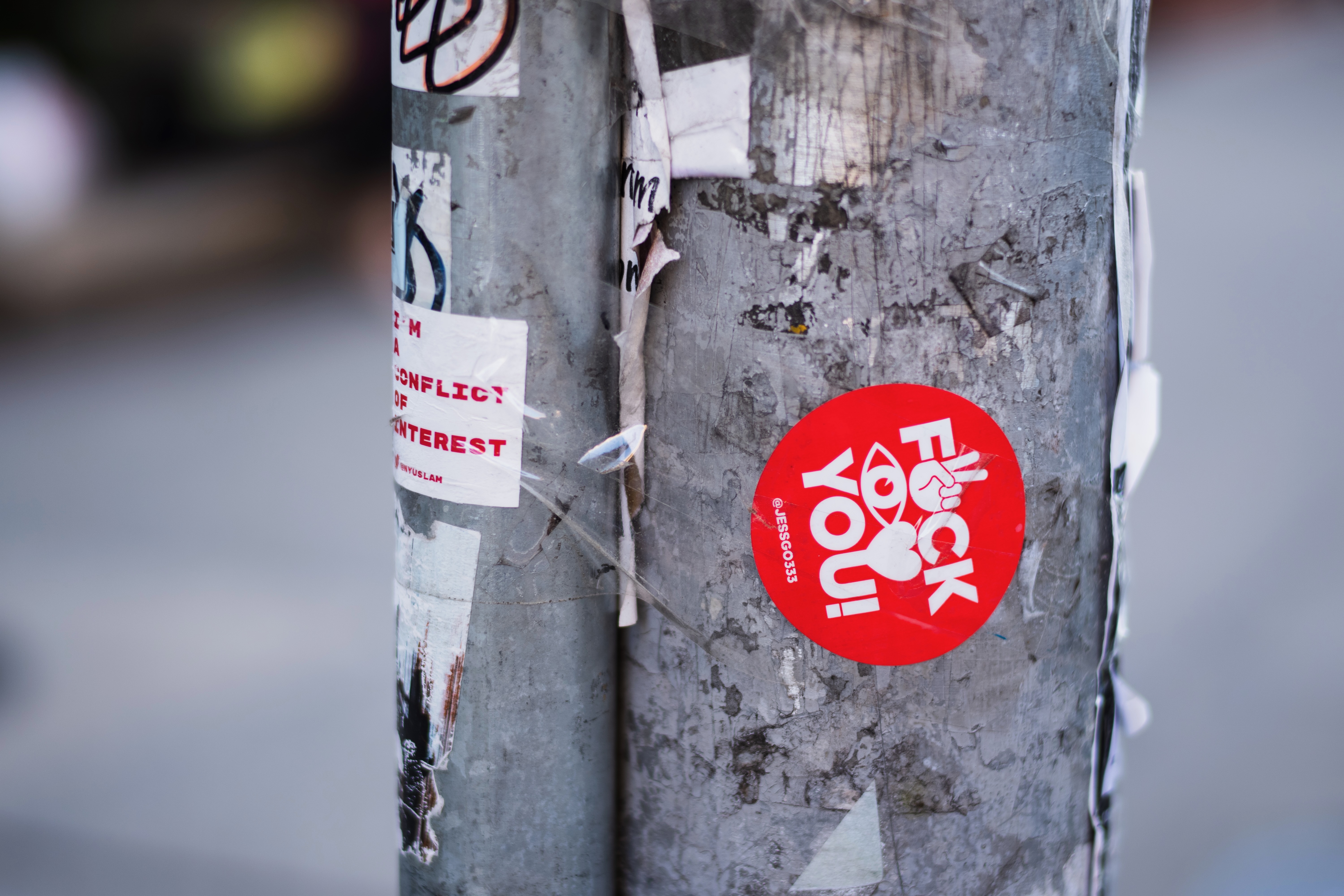 The photograph captures a close-up view of a weathered pole adorned with various stickers, prominently featuring a bold red sticker that declares 'F*** YOU!' The composition evokes a rebellious and edgy mood, enhanced by the contrast between the vibrant color of the sticker and the muted tones of the pole and surrounding environment. The soft focus on the background creates an intimate, yet gritty urban atmosphere that invites contemplation of street art and protests.