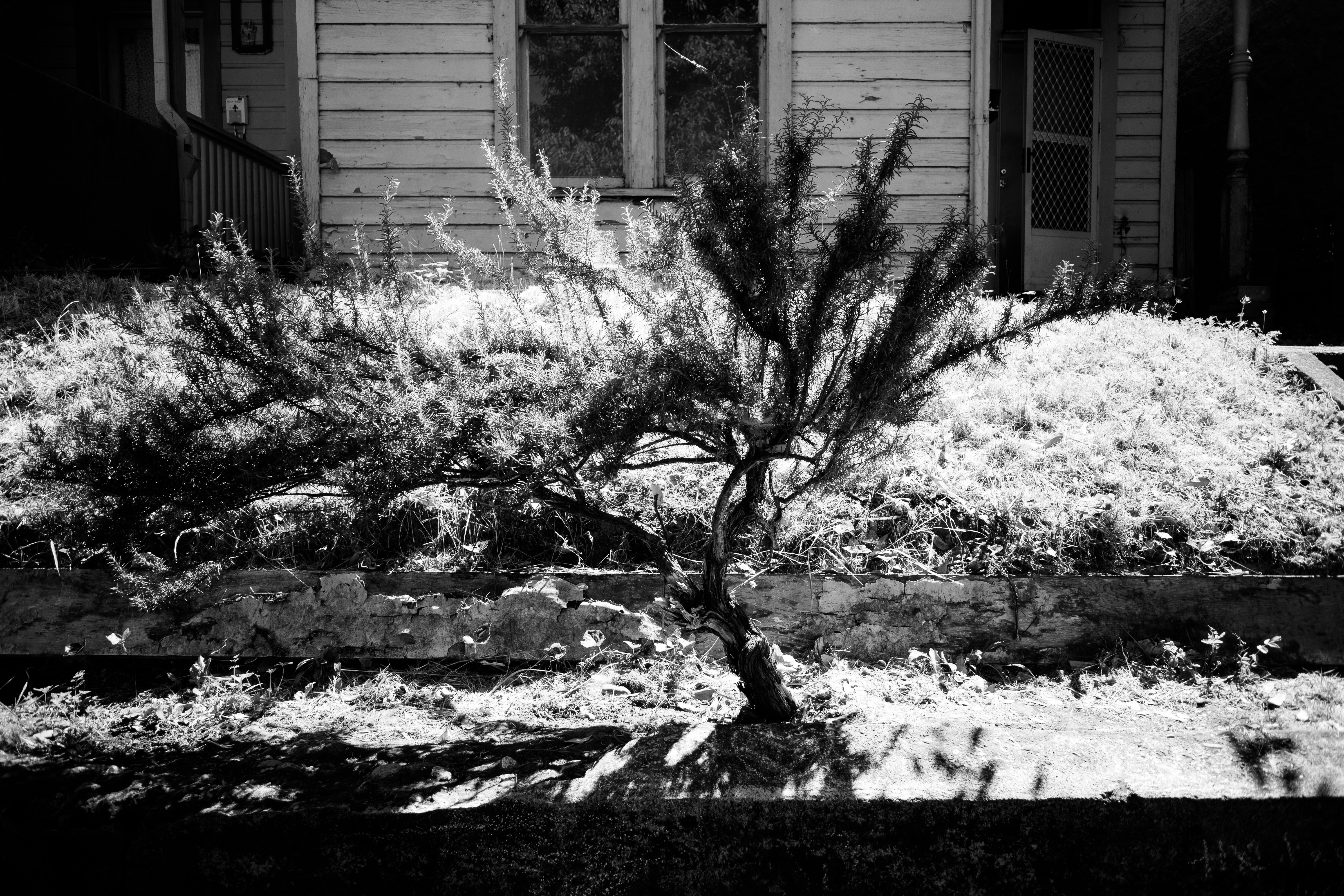 In this monochromatic photograph, an aged tree is framed by an old wooden house, creating a stark contrast between life and decay. The dramatic interplay of light and shadow enhances the ethereal mood, evoking a sense of nostalgia and quiet resilience. The composition draws the eye from the sprawling branches of the tree to the weathered facade behind it, inviting contemplation of their intertwined histories.