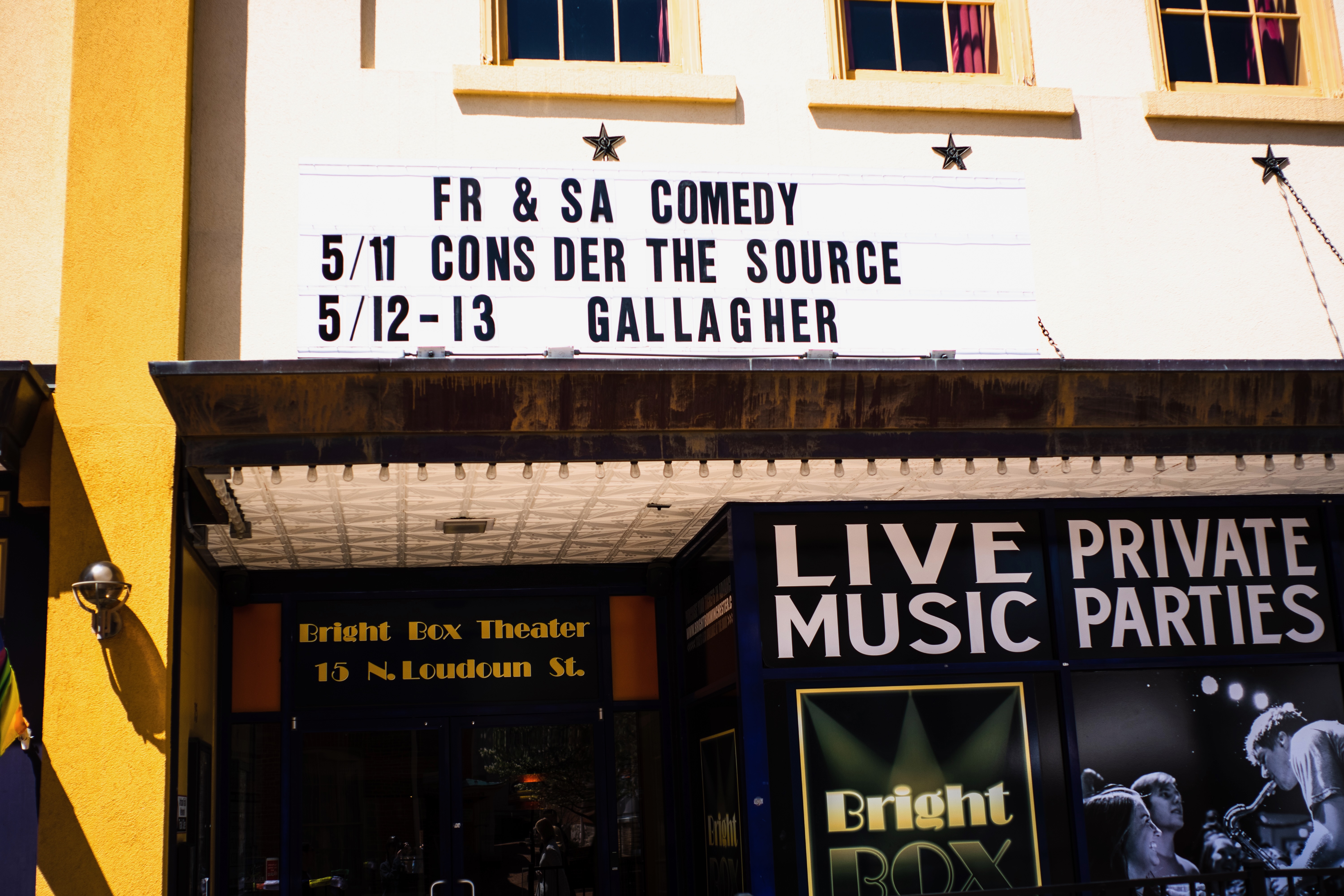 The photograph captures the inviting façade of the Bright Box Theater, with its bold marquee announcing upcoming comedy shows. The bright sunlight casts a cheerful glow, enhancing the lively vibe of the venue. The contrasting colors and playful typography draw attention, beckoning passersby to engage with the entertainment inside.