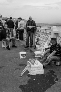 The photograph captures a bustling fishing scene, where a group of men, engaged in their pursuits, contribute to a sense of camaraderie and shared purpose. The monochromatic tones enhance the mood, highlighting the expression and character of the individuals amidst a serene coastal backdrop. Soft lighting casts gentle shadows, adding depth to the composition and emphasizing the textures of the scene.