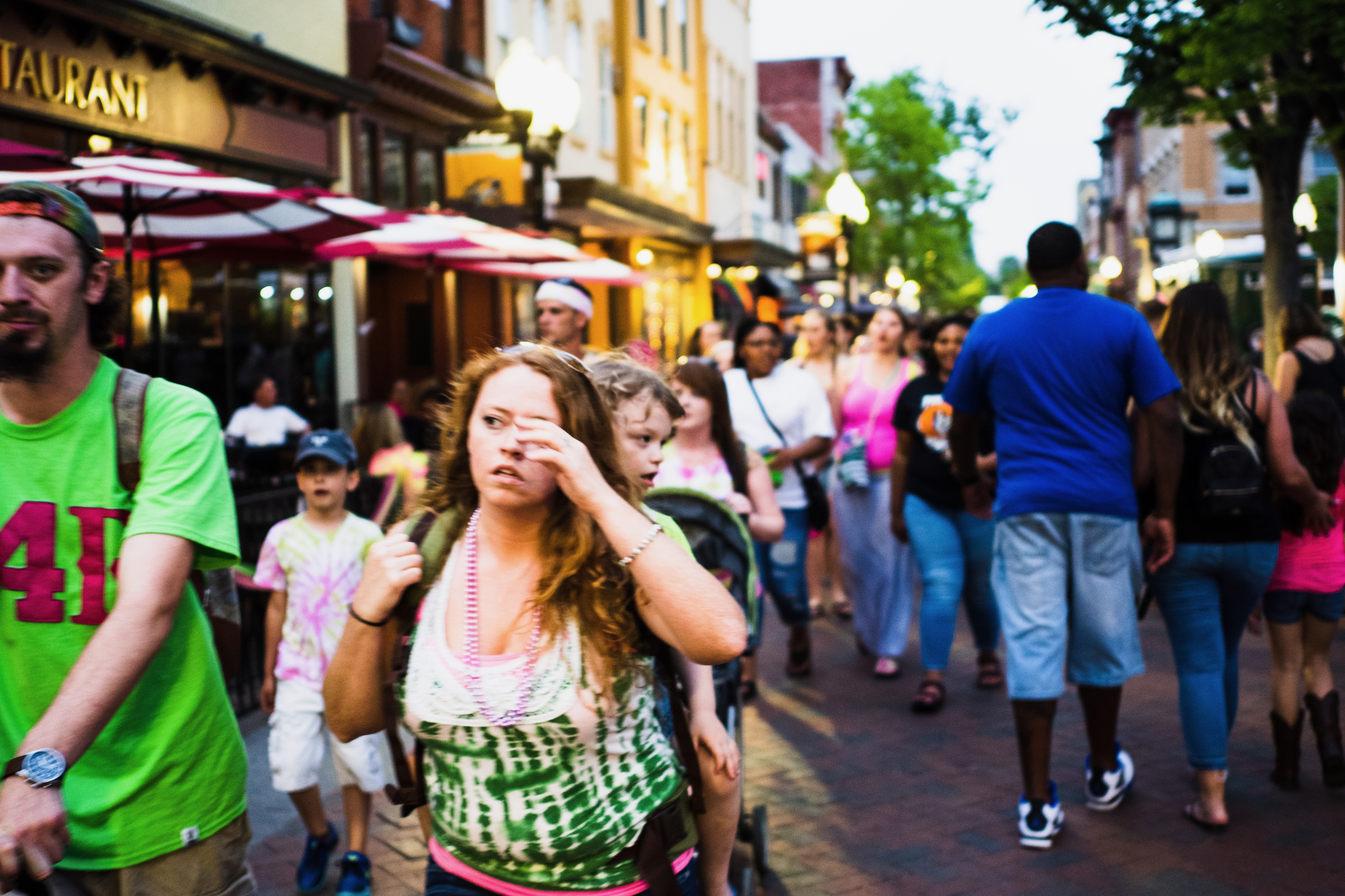 The photograph captures a lively street scene filled with people of all ages, creating a vibrant atmosphere. Soft twilight gives the setting a warm glow, while the varied clothing colors suggest a festive mood. The composition invites viewers into the bustling scene, highlighting the interaction among the diverse crowd.