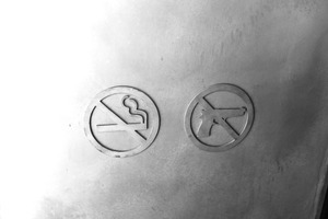 This photograph features two distinct prohibition signs sculpted in metal—a no smoking symbol next to a no firearms symbol. The stark contrast of metallic textures against a gradually fading white background creates a somber mood, evoking a sense of caution and regulation. The composition invites contemplation on the duality of restrictions in modern life, highlighted by the dramatic interplay of light and shadow.