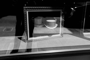 This black-and-white photograph captures two vintage hats displayed in a framed window, evoking a sense of nostalgia and sophistication. The play of light and shadow creates a dramatic contrast, highlighting the intricate details of the hats while hinting at the outside world through the glass reflection. The composition draws the viewer's eye to the hats, enveloping them in a timeless ambiance.