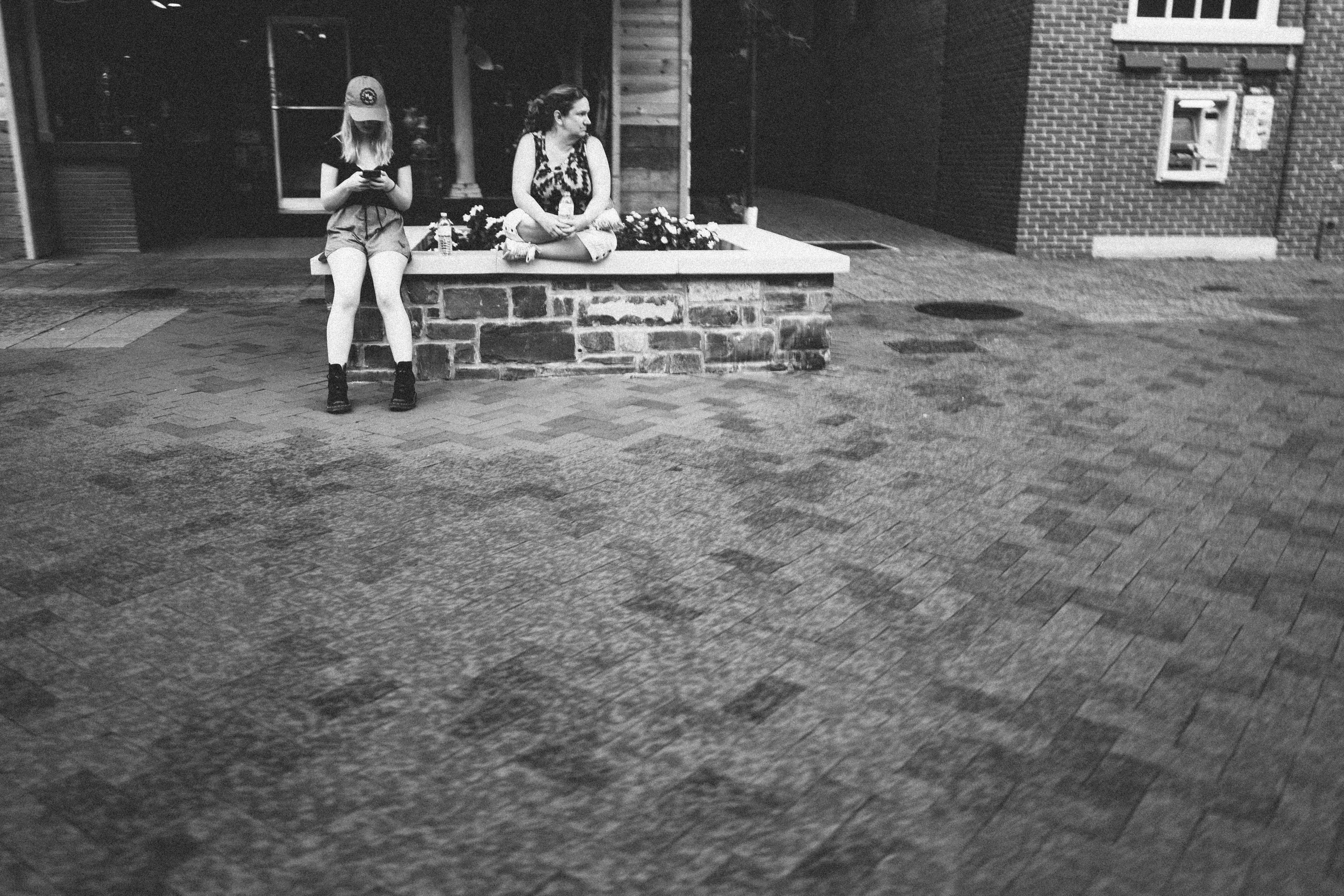 In this striking black-and-white photograph, two women occupy a central stone structure, each absorbed in their own world. The young girl, dressed casually in a cap and shorts, is fixated on her phone, exuding a sense of youthful detachment, while the other woman, seated cross-legged, gazes thoughtfully into the distance. Soft, diffused lighting enhances the contemplative mood, contrasting their individual experiences against the serene backdrop of the brick-lined street.
