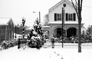 A quiet, snow-covered house stands stoically in a winter landscape, its black-and-white hues emphasizing the stillness of the scene. The heavy snow blankets the ground and clings to the evergreen trees, creating a serene, almost nostalgic mood. The gentle light diffuses through the falling snow, casting a soft, ethereal glow over the entire composition.