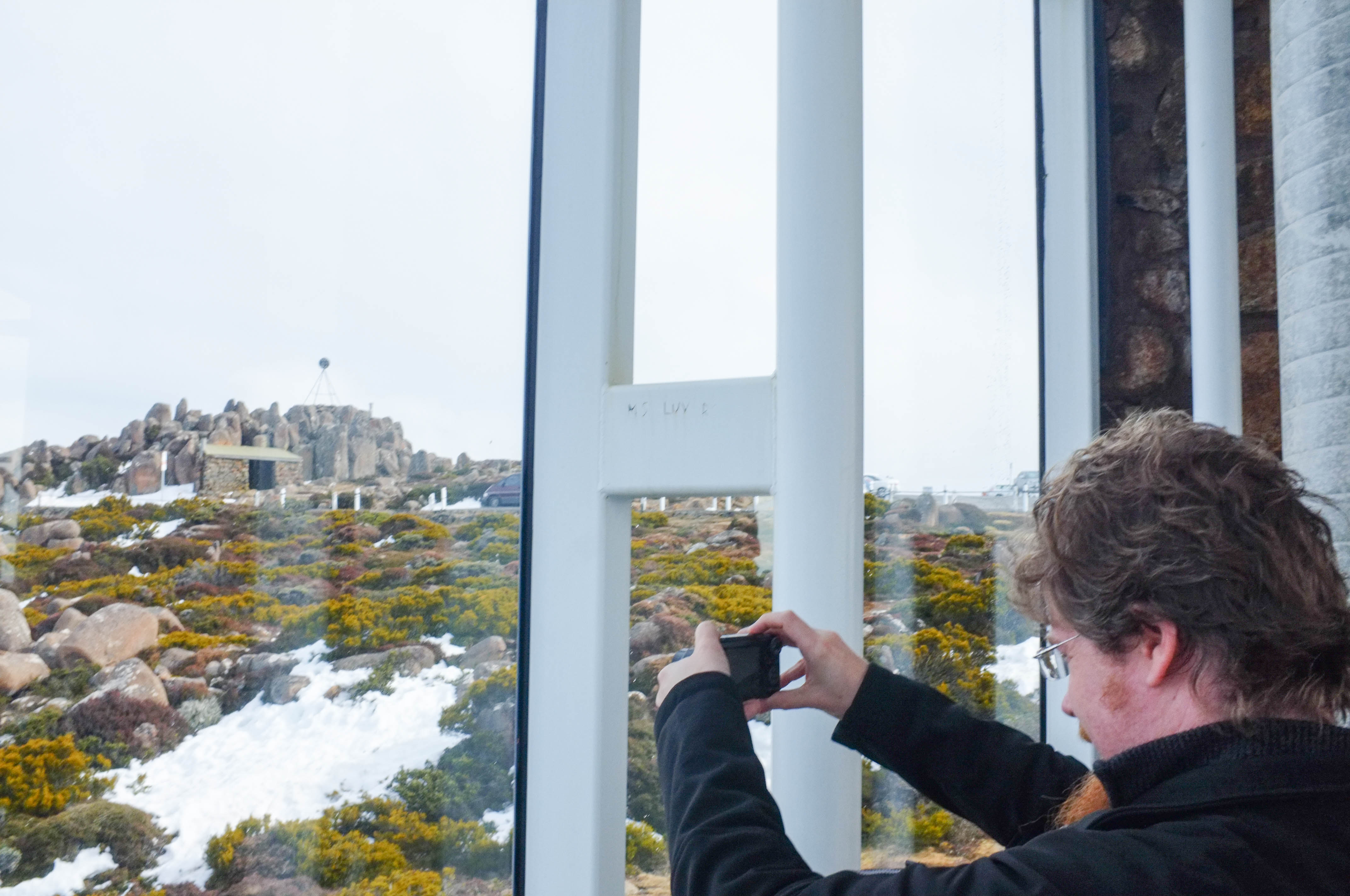 A figure stands framed by sleek white columns, capturing the sweeping, rugged landscape outside through a window. The ambiance is contemplative and serene, with muted colors highlighting the contrast between the snow and greenery. Soft, diffused light gently envelops the scene, enhancing the sense of quiet wonder in this remote setting.