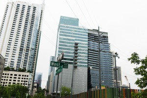 This photograph captures a dynamic urban landscape, showcasing a cluster of modern skyscrapers set against a gray, overcast sky. The contrasting lines of the tall buildings dominate the composition, while the soft lighting creates a muted mood, emphasizing the sleek glass and steel architecture. Street signs and greenery offer a glimpse of life below, grounding the towering structures and adding a touch of vibrancy to the scene.