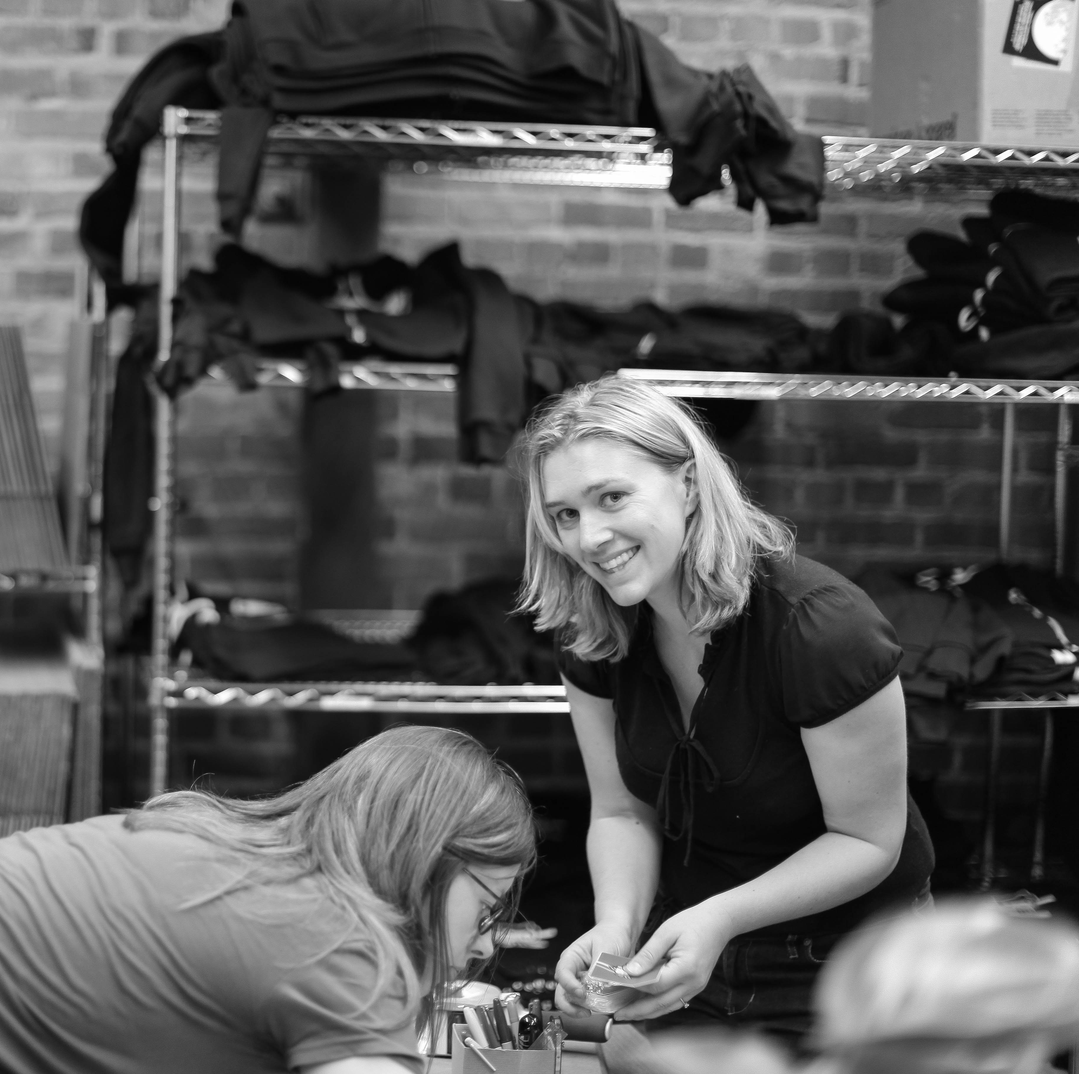In a warm, industrial space, two women engage in a collaborative project under soft, diffused lighting that casts gentle shadows on the brick wall behind them. One woman, with a welcoming smile, stands at the forefront, exuding a sense of camaraderie and focus, while the other leans in, deeply engaged in their task. The monochrome tone enhances the intimate atmosphere, emphasizing the shared effort and connection in their work.