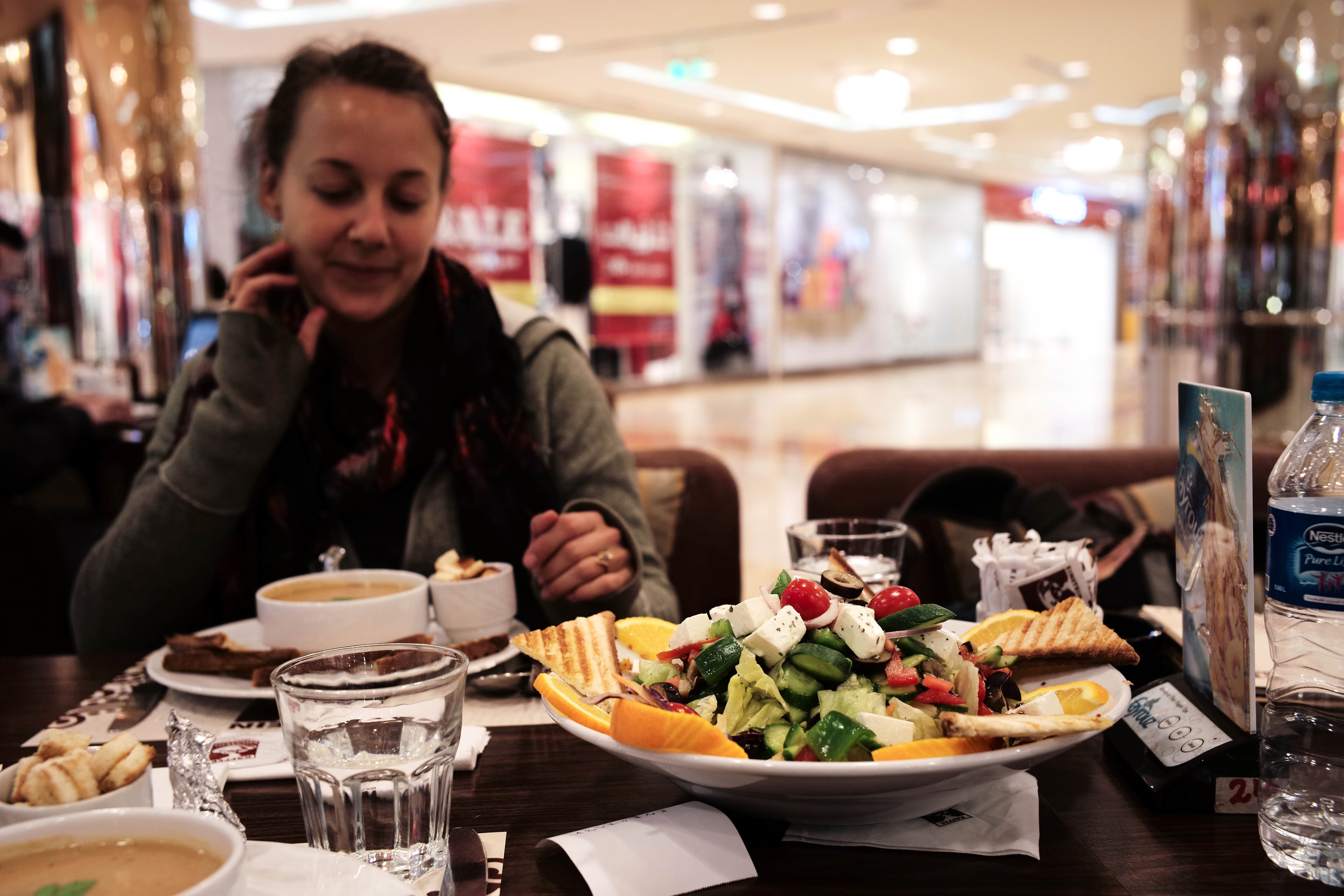 A woman sits at a cozy table, her focus resting on a vibrant plate of salad that dominates the foreground. The soft glow of indoor lighting creates an inviting atmosphere, contrasting with the busy backdrop, hinting at a moment of tranquility amidst the hustle of the mall. The arrangement of food illustrates a fusion of textures and colors, inviting engagement and appetite.