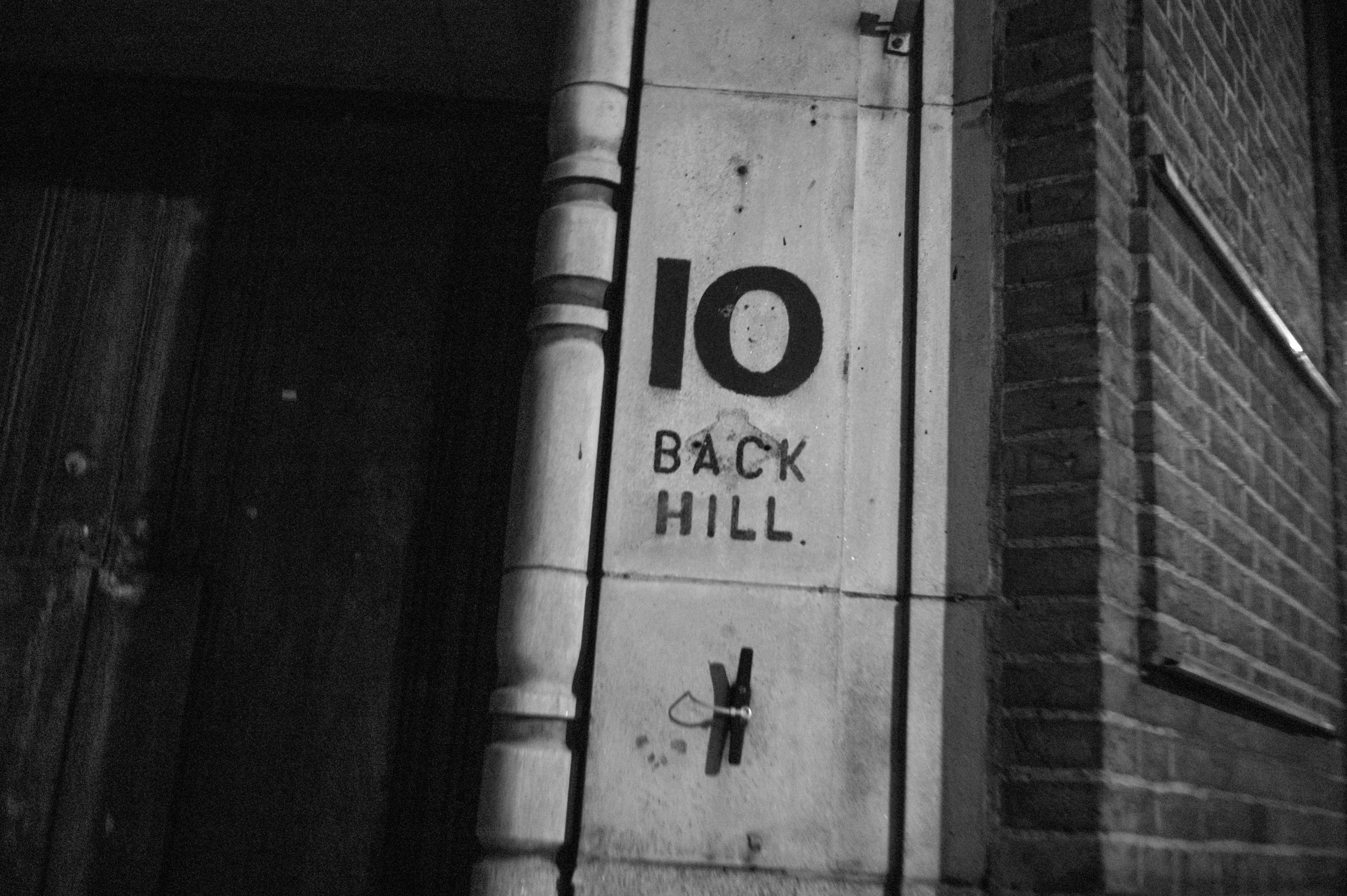 This photograph captures a close-up of a weathered building entrance marked '10 BACK HILL.' The low lighting and monochrome tones evoke a sense of mystery and nostalgia, hinting at untold stories hidden within the walls. The texture of the weathered surface and the stark contrast between the signage and the surrounding brick create a compelling focus, drawing the viewer into this forgotten corner of the city.
