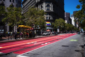 The photograph captures a vibrant city street bustling with life under a clear blue sky. The bright red tram tracks contrast strikingly against the gray buildings, while scattered trees offer a touch of greenery, adding to the lively atmosphere. A sense of community is evident as pedestrians gather around the bus stop, alluding to the dynamic interplay of urban living.