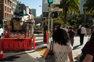 The photograph captures a bustling city scene with pedestrians navigating around construction barriers and equipment. Strong sunlight casts vivid shadows, highlighting the contrast between the everyday hustle of the crowd and the disruption caused by the maintenance work. The vibrant palm trees and clear sky add a touch of life to the urban landscape, creating a dynamic interplay between chaos and routine.