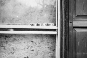 This photograph captures a close-up view of a weathered glass window with a sign reading 'PLEASE USE SIDE DOORS.' The black and white composition evokes a sense of nostalgia and abandonment, accentuated by the blurred, rough texture of the wood beneath. Soft, diffused lighting enhances the melancholic mood, inviting contemplation on forgotten spaces and unseen pathways.