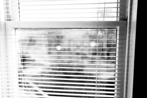 The photograph captures a window with horizontal blinds, partially obscuring a blurred scene outside. The monochromatic tones evoke a sense of nostalgia and solitude, while the dust on the glass adds an element of time's passage. The soft, diffused light filtering through the slats creates a contemplative mood, inviting viewers to ponder what lies beyond.