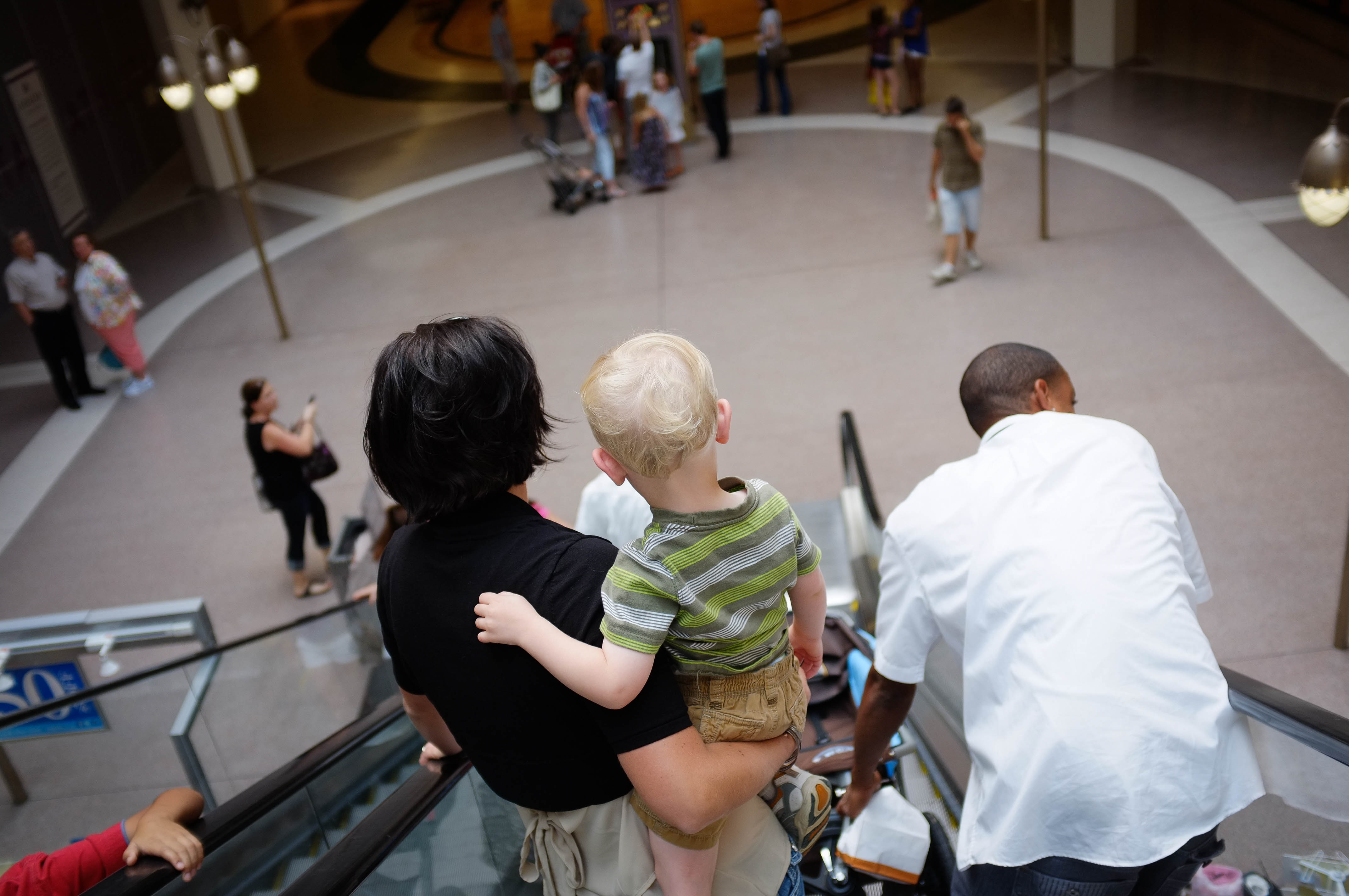 Captured from above, this photograph portrays a woman holding a child as they descend an escalator, suggesting a moment of exploration. The atmosphere is casual and lively, with blurred figures of onlookers in the background, hinting at a bustling setting. Soft lighting enhances the warmth of the scene, creating an inviting and familial mood.