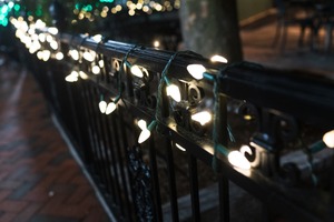 A close-up of a wrought-iron fence adorned with glowing white fairy lights creates an enchanting and intimate atmosphere. The soft illumination contrasts with the dark surroundings, inviting a sense of warmth and festivity. The focused composition draws the viewer's eye along the curving fence, leading into a shimmering, blurred background of lights.