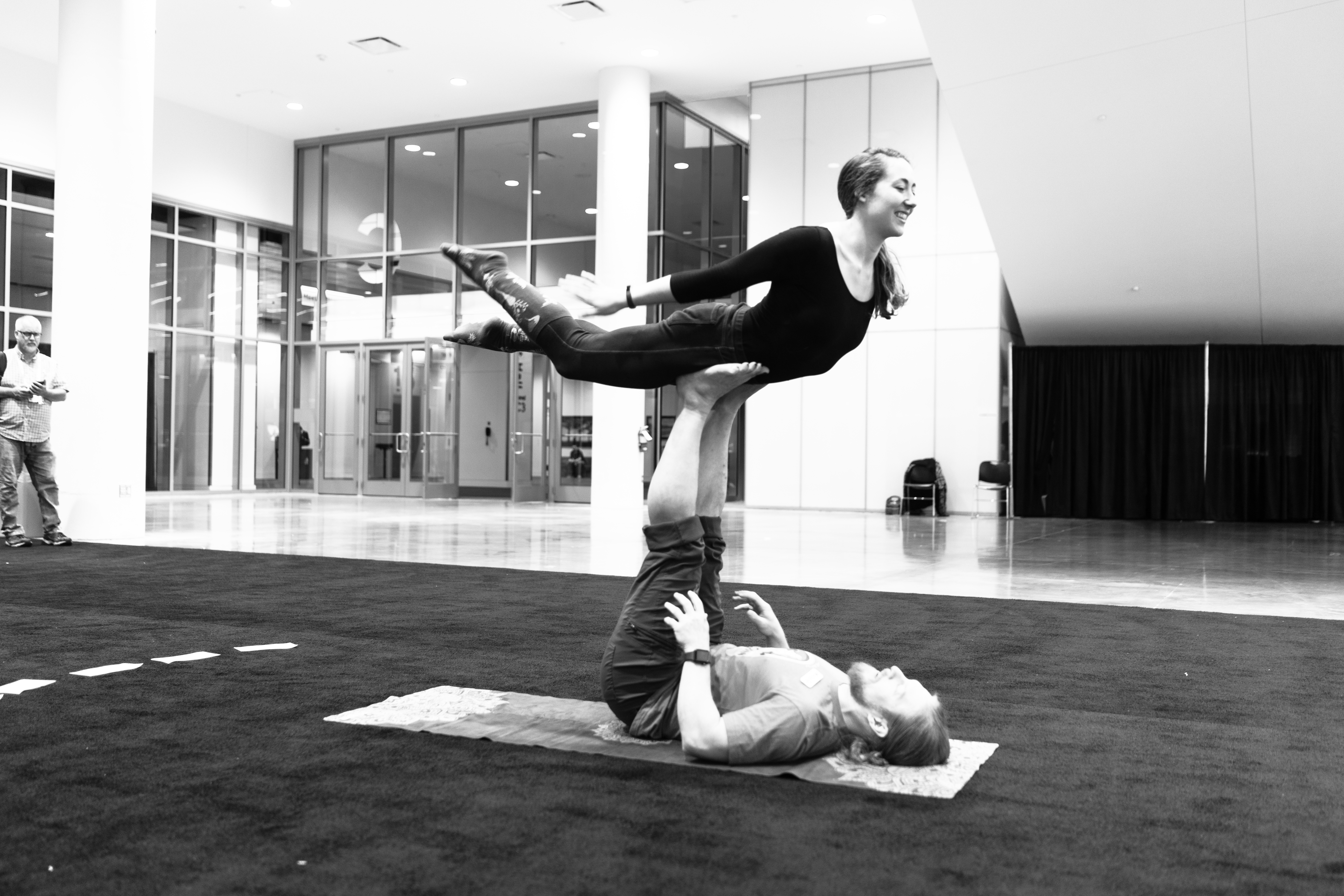 In a striking black-and-white scene, a woman gracefully balances above a man lying on a mat, encapsulating trust and teamwork. The spacious, minimalist background emphasizes their dynamic pose, highlighting the contrast between their forms and the surrounding architecture. The mood is lively and instructive, celebrating the joy of movement and connection in a public setting.