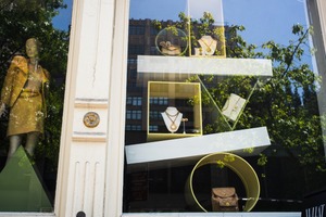 This photograph captures a chic storefront display, showcasing luxurious jewelry and a fashionable outfit. The bright, natural lighting enhances the vibrant colors of the accessories while reflections from the outside world add a layer of depth, blending urban life with high fashion. The composition is sleek, with geometric frames drawing the viewer’s eye toward the exquisite pieces within.