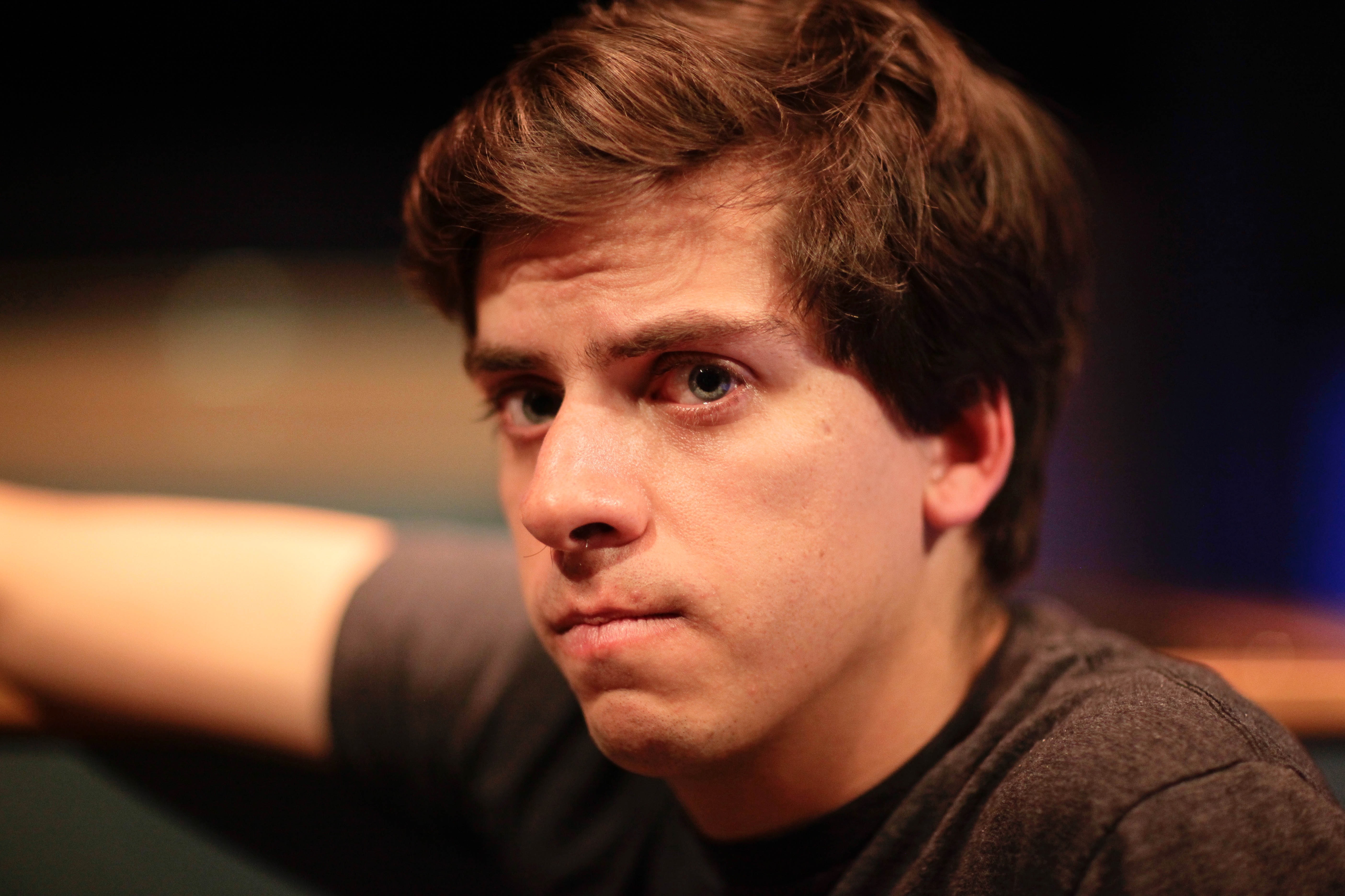 The photograph captures a young man in a contemplative mood, his piercing gaze drawing the viewer in. Soft, focused lighting highlights his expression, creating a sense of intimacy and introspection. The blurred background adds depth, emphasizing the weight of his thoughts against a subtle, moody backdrop.