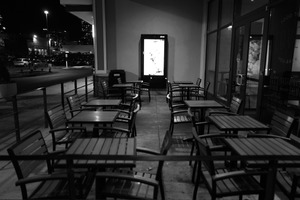 An empty outdoor seating area, framed by rows of wooden tables and chairs, evokes a sense of stillness in the night. The stark black-and-white contrast emphasizes the shadows and soft lighting from nearby urban surroundings, creating a contemplative atmosphere. The solitary vending machine stands as a silent sentinel, adding an element of isolation to the scene.