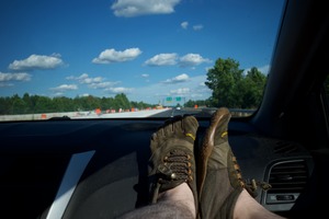 This photograph features a close-up of a pair of feet resting comfortably on the dashboard of a car, with the open road stretching out ahead under a bright blue sky dotted with fluffy clouds. The mood is relaxed and contemplative, evoking a sense of freedom during a journey. Warm sunlight casts soft shadows, accentuating the details of the shoes and creating a tranquil ambiance.