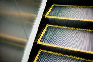 The photograph captures a close-up view of escalator steps, showcasing their intricate details and textures. The composition emphasizes sharp lines and a rhythmic pattern, with the bright yellow edges contrasting against the cool metallic tones. This creates a mood of modernity and movement, inviting the viewer to contemplate the journey as well as the design.