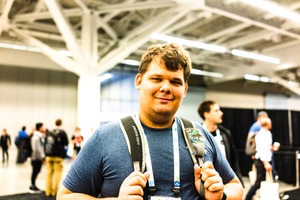 The photograph captures a young man with a friendly smile in a bustling event environment, characterized by soft lighting and a slightly blurred background. His casual attire and backpack suggest a relaxed atmosphere, while the bright colors add a vibrant and cheerful mood to the scene. The composition centers on him as he stands amidst a mix of blurry figures, creating a sense of engagement and camaraderie.