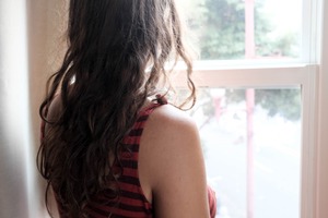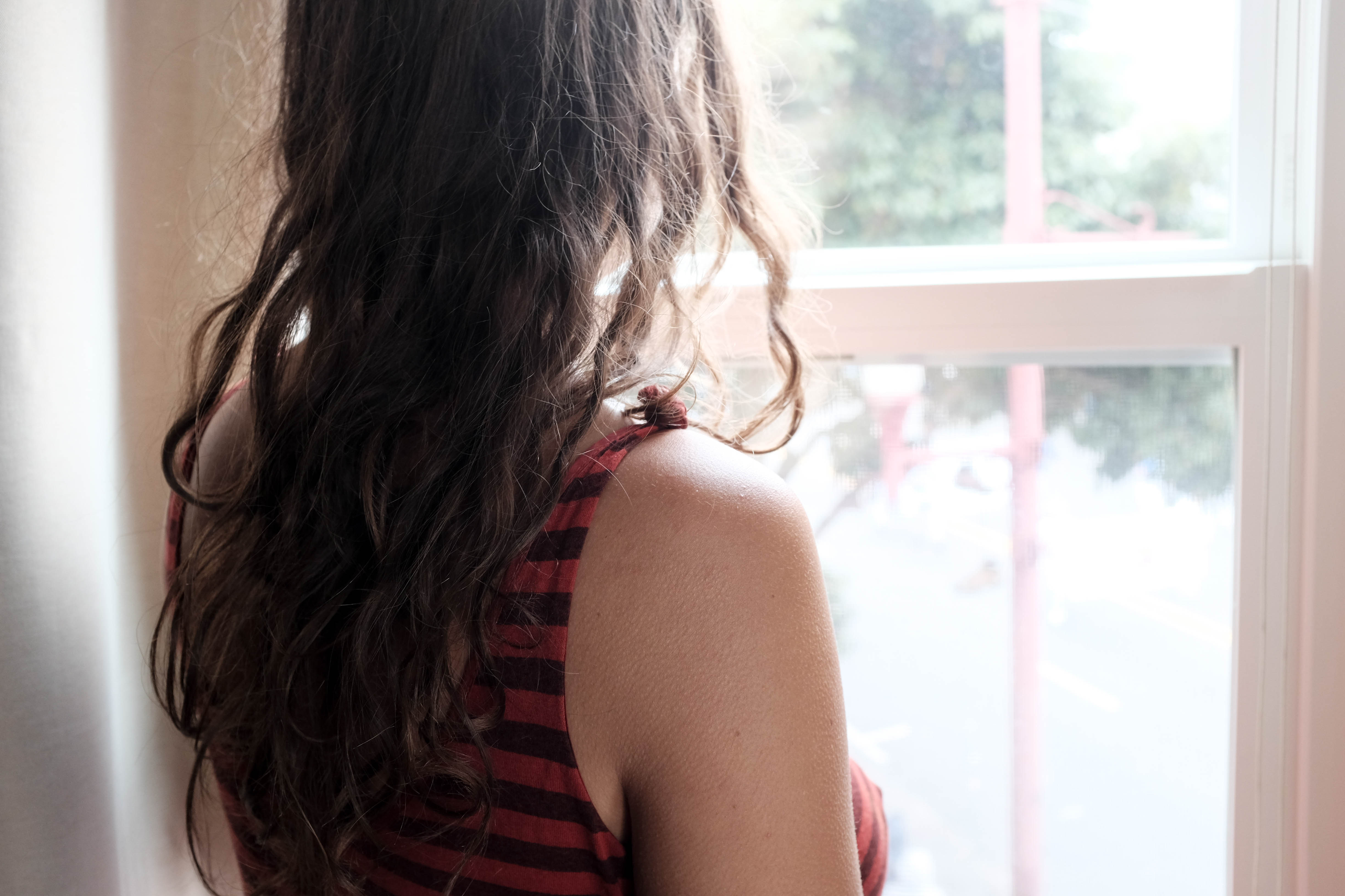 A young woman gazes out a window, her curly hair cascading down her back. The soft, diffused light creates a gentle atmosphere, highlighting her relaxed posture and the striped fabric of her top. This serene moment captures a sense of introspection and quietude, with hints of urban life subtly blurred in the background.