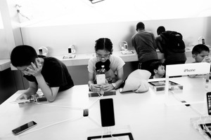 In a sleek, modern retail environment, a group of children is absorbed in their devices, illustrating a juxtaposition of digital engagement against a backdrop of consumer technology. The monochrome palette enhances the somber mood, emphasizing a sense of isolation despite the bustling surroundings. The composition is intimate, drawing attention to their focused expressions as they momentarily escape the physical world around them.