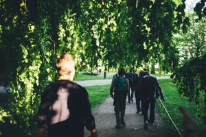 A group of people strolls along a sunlit path, framed by lush, overhanging leaves that create a canopy. The dappled light filters through, casting playful shadows and emphasizing the serene, communal atmosphere of their walk. The composition draws the eye forward, inviting the viewer to share in this tranquil outdoor journey.