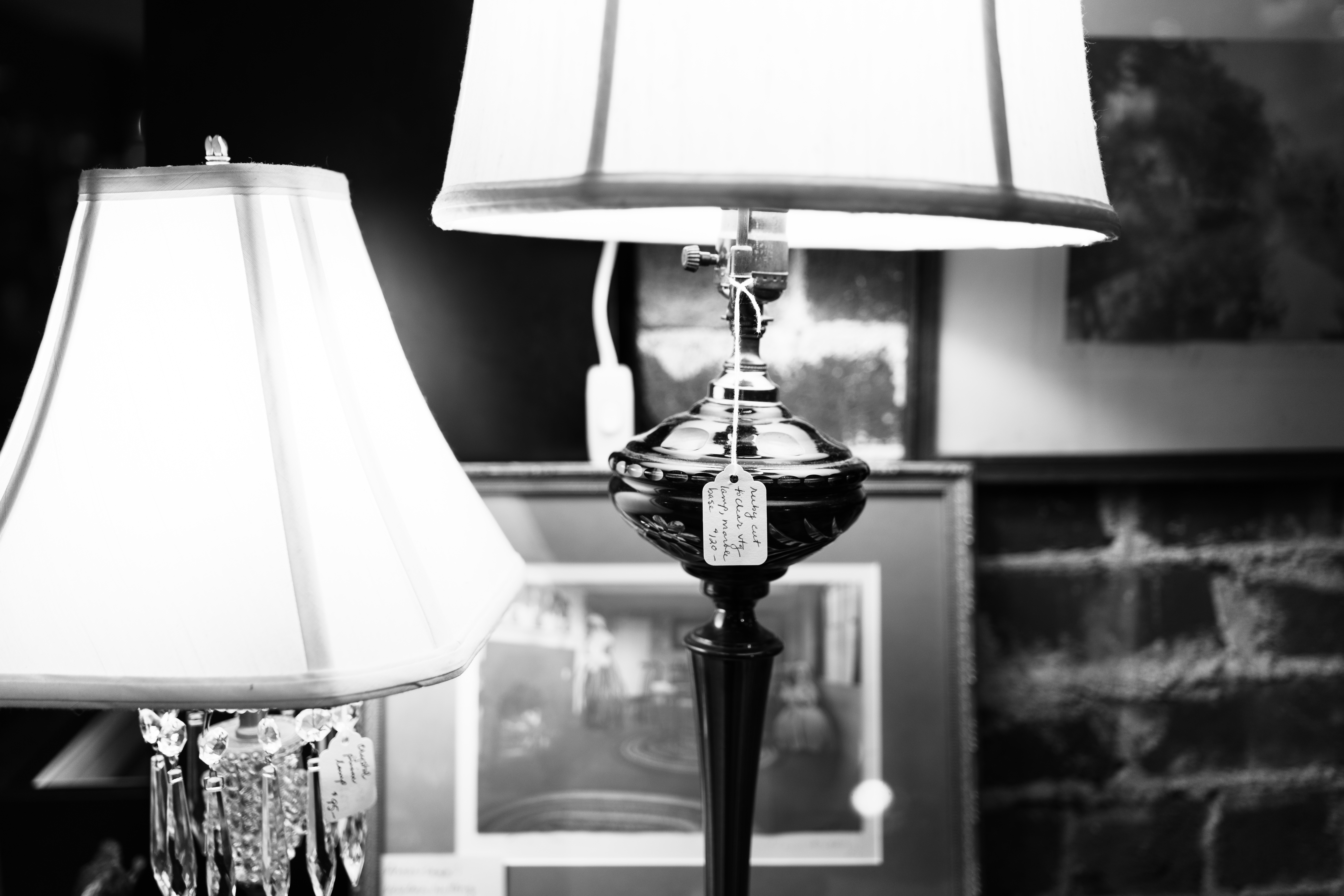 This black-and-white photograph captures a pair of lamps, one elegantly adorned with crystals and the other a sleek, dark design featuring a price tag. The composition draws focus to their contrasting textures and forms, while soft lighting casts gentle shadows, creating a nostalgic and intimate atmosphere. The interplay of light and dark adds depth to the vintage charm, inviting contemplation of their stories.