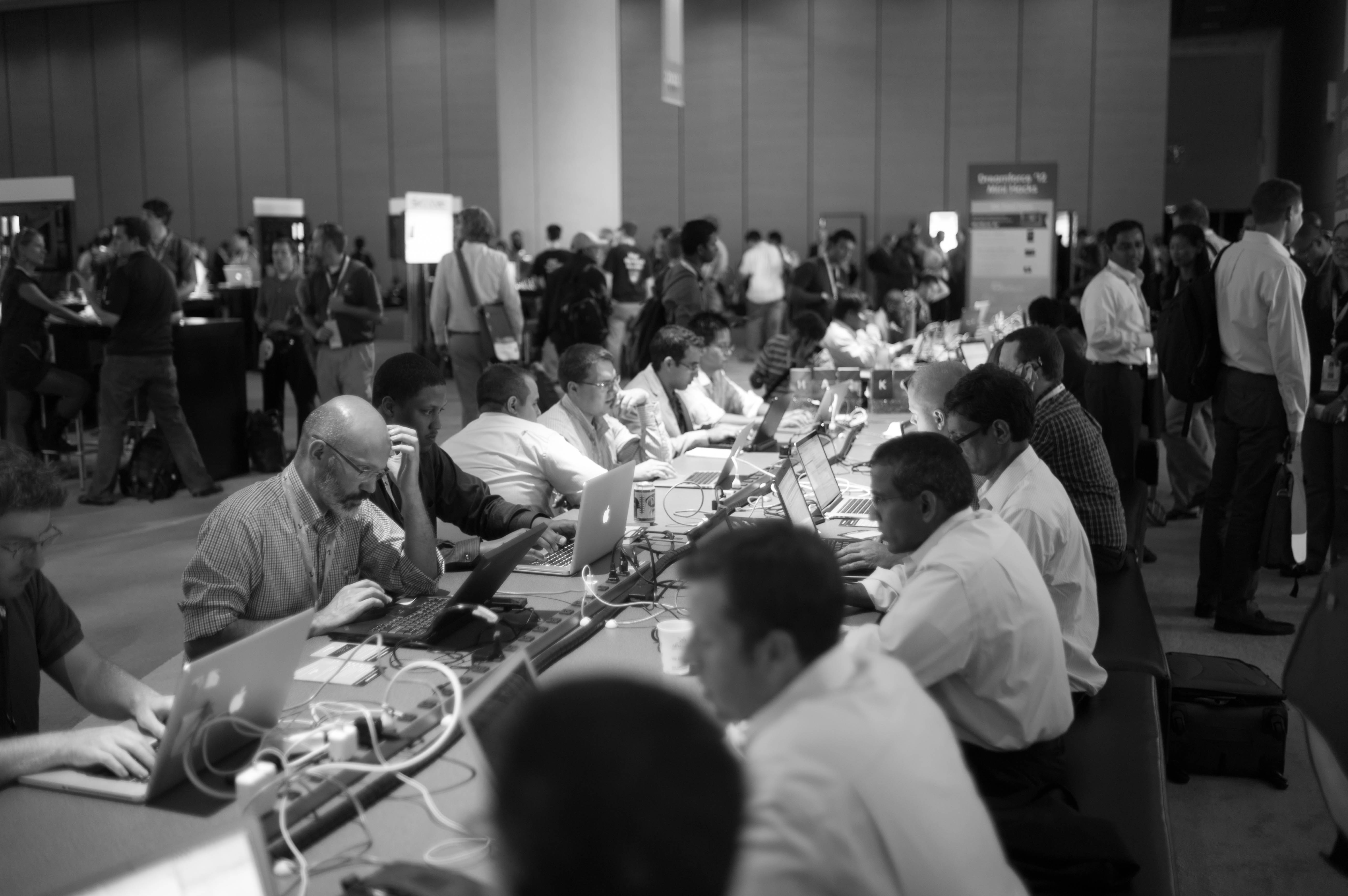 In a bustling environment, a long table filled with individuals deeply focused on their laptops creates a stark contrast against the blurred movement of the crowd behind them. The monochrome palette enhances the seriousness of their concentration, illuminating the commitment to their tasks. The lighting is soft yet sufficient, drawing the viewer's attention to the intense engagement of the subjects while capturing the lively atmosphere of connection and collaboration around them.