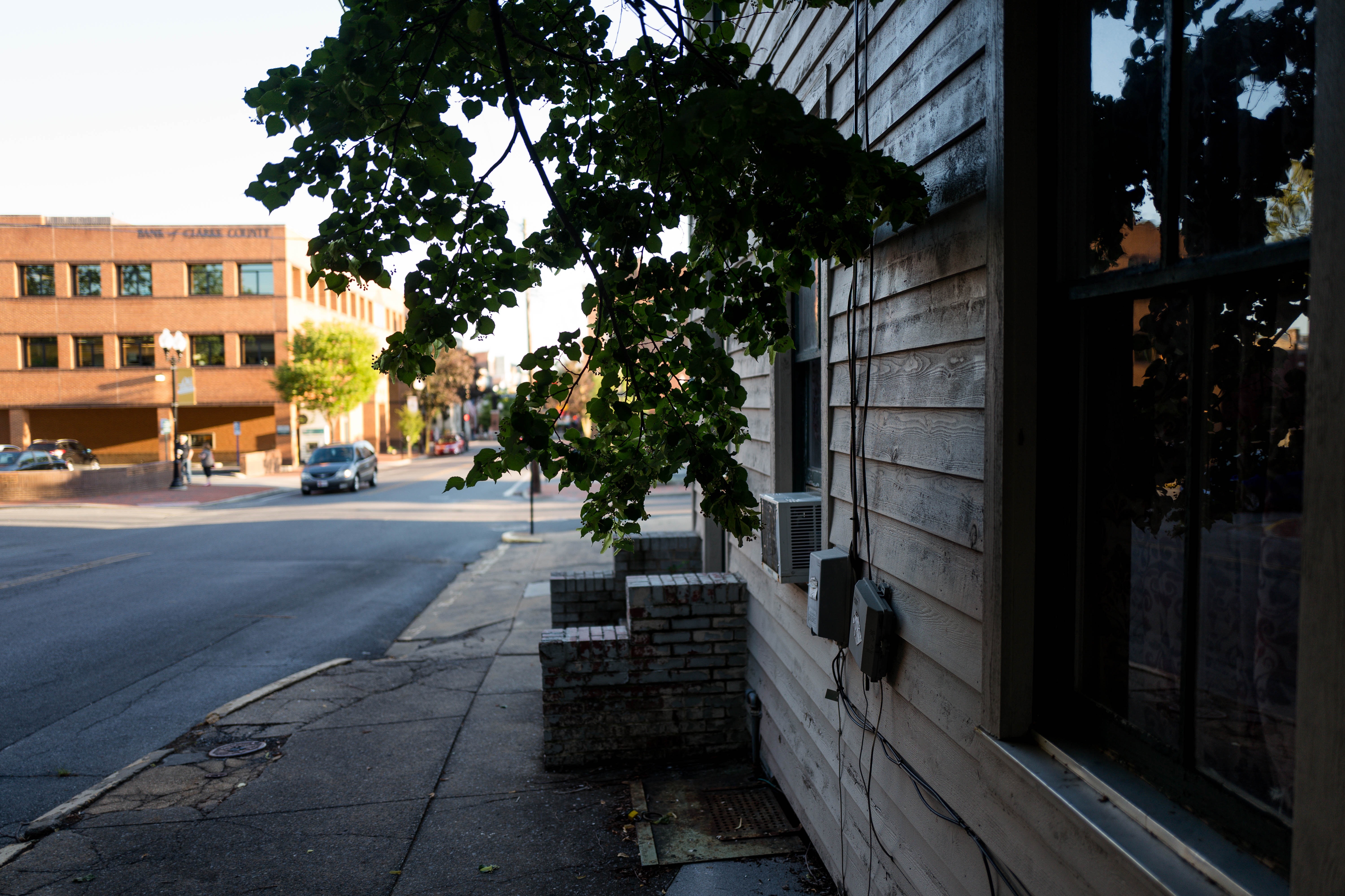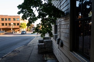 The photograph captures a tranquil moment on a city street, where shadows play across a weathered wooden building. A leafy branch frames the scene, adding a touch of nature to the urban backdrop of a brick building and a quiet sidewalk. The warm daylight filtering through creates a calm, inviting atmosphere, evoking a sense of nostalgia and peace in the bustling environment.